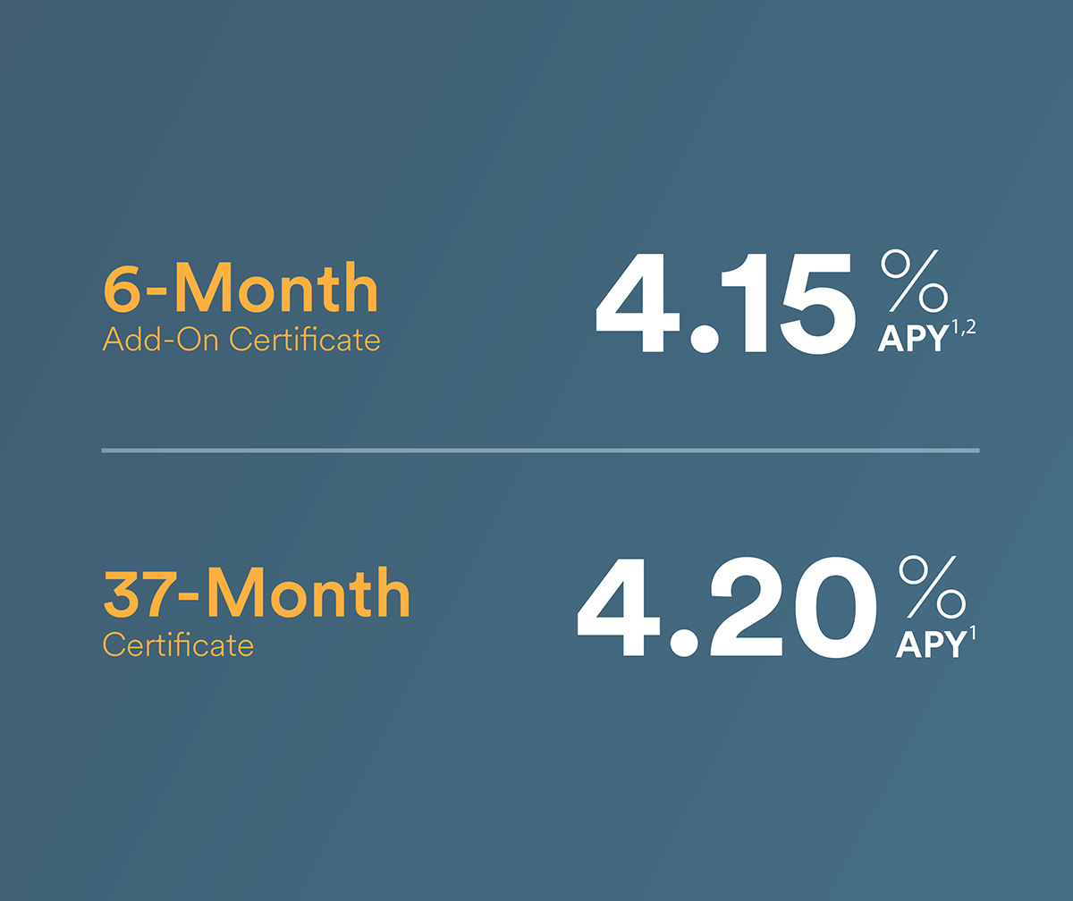 1. Minimum $500 to open a share certificate. Rates quoted are effective as of 10/13/2025 and are subject to change without notice. Early withdrawal/account closure subject to penalty; fees may reduce earnings on the account. At maturity, account automatically renews into a standard term certificate for the same term at the current rate. During the 10-day grace period, which begins on your maturity date and ends 10 calendar days later, you may change the term or balance of your account or make withdrawals without a penalty. Promotional share certificates are not eligible as security for share certificate loans.
